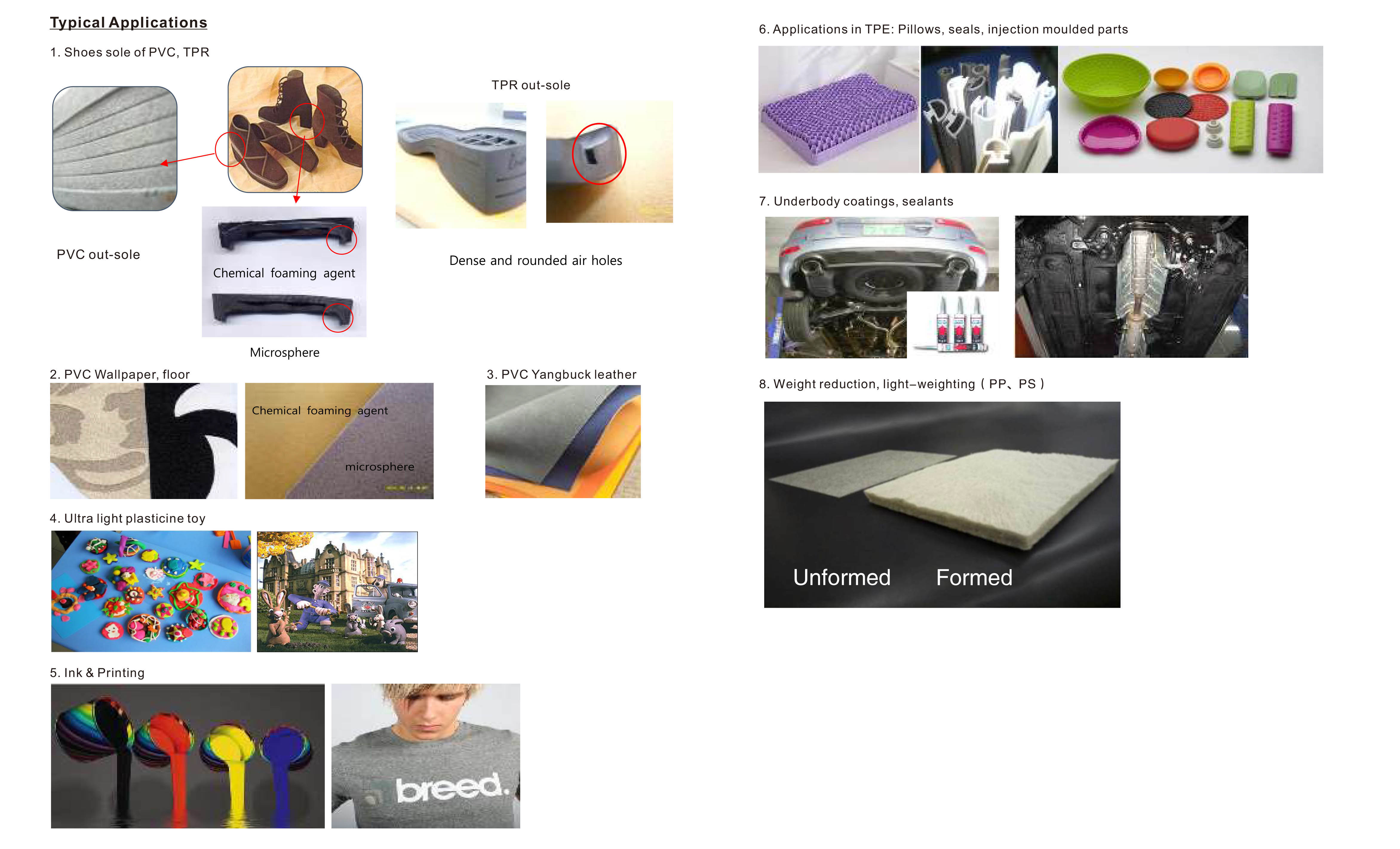 R&D personnel of JINLANG Company had assimilated the excellents production and application technology of the foaming agents both at home and abroad, and based on this, they had successfully developed more excellent performance and competitive modified foaming agents. These series of foaming agents are widely used in the injection technology of EVA MD, EVA slippers, PVC soft and hard foamed products, TPR, rubbers, PE, PS, NBR+PVC copolymer and other various engineering foamed products.